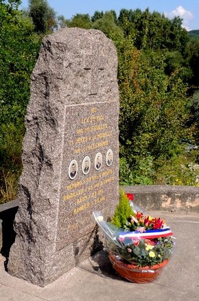 | PONT DE BAYON, à gauche juste avant le pont en arrivant de Roville.(vers les étangs) Stèle érigée par la population de Roville en mémoire des 4 victimes du 4 septembre 1944 . Parmi les suppliciés, J. Barbier, membre du BOA de Meurthe-et-Moselle, dirigé par André Mawois, dont le PC était à Roville-devant-Bayon ![]() |