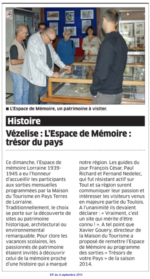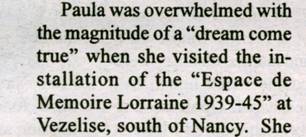 juillet/août/septembre 2012 « Paula fut émerveillée et eut le sentiment « qu’un rêve était devenu réalité » lorsqu’elle découvrit les installations de l’Espace de Mémoire Lorraine 1939-1945 à Vézelise au sud de Nancy » |