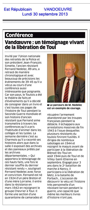 Fernand Nedelec " 1939 - 1945 La RESISTANCE en LORRAINE " Mardi 5 juin à 20h30 Loisirs & Rencontre 1 rue Gustave Lemaire Heillecourt |