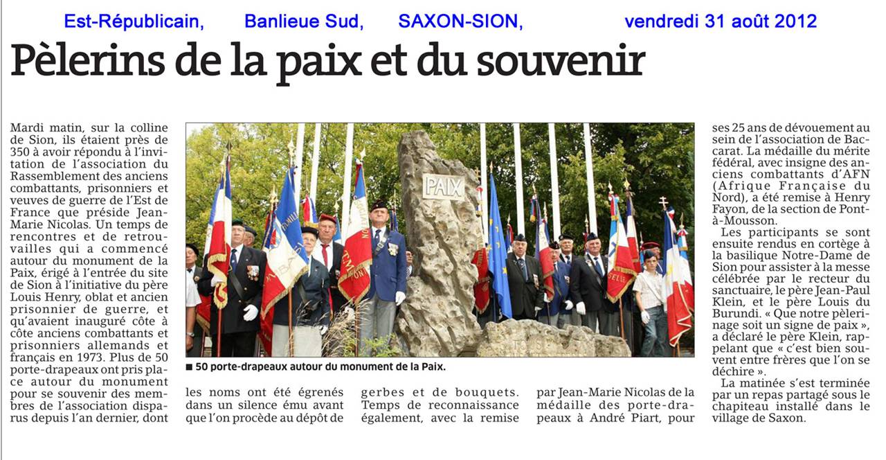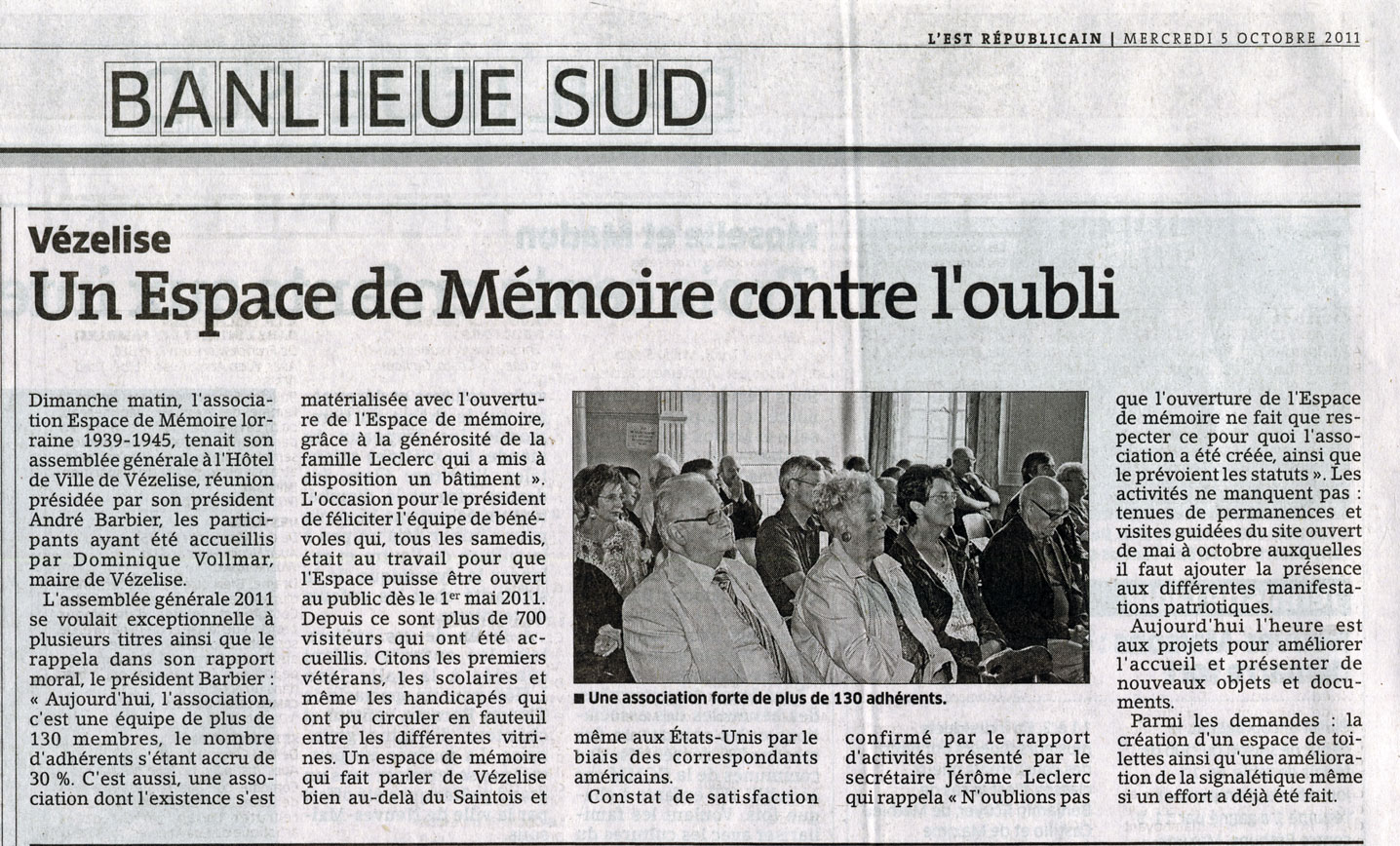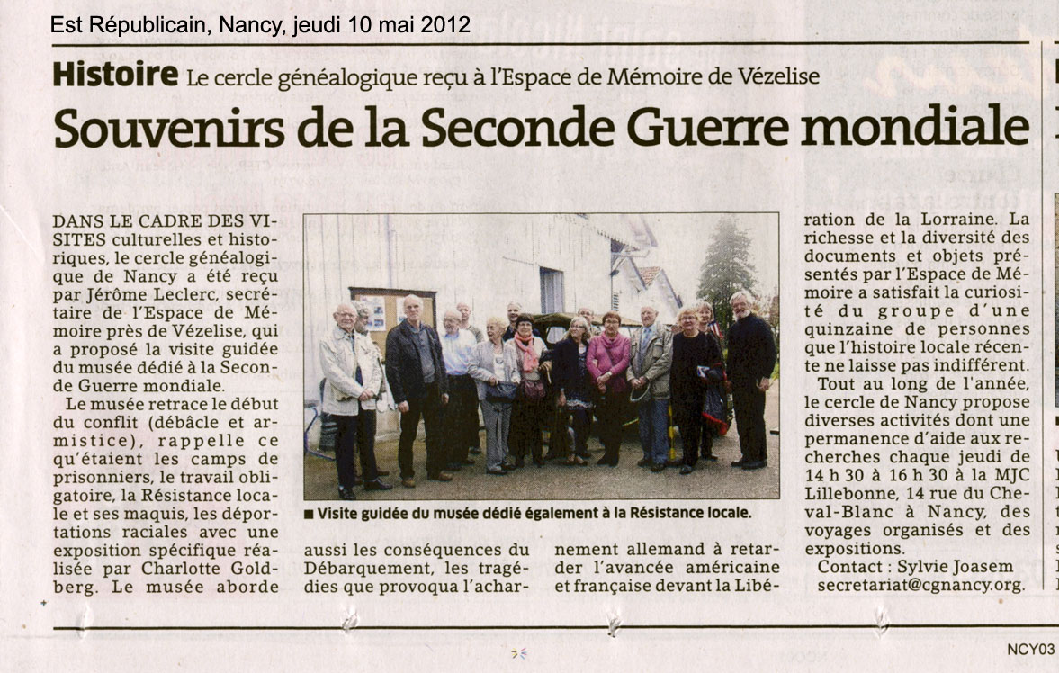 L'Est Républicain Sur la visite du cercle généalogique de Nancy *********** Visite ce Mardi 08 mai 2012 des membres de l’association US Veterans Friends Luxembourg qui venaient préparer le voyage qu’ils envisagent pour septembre prochain. |
