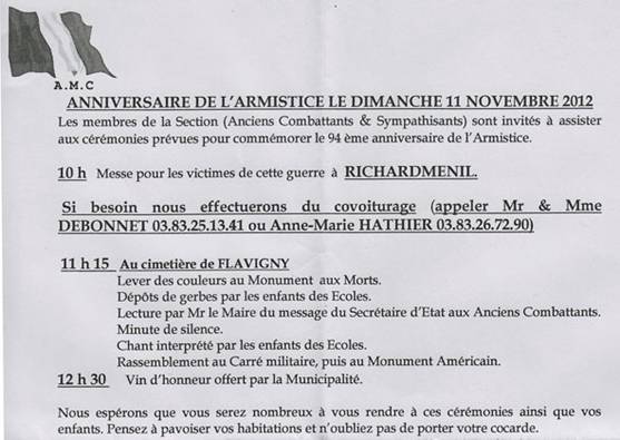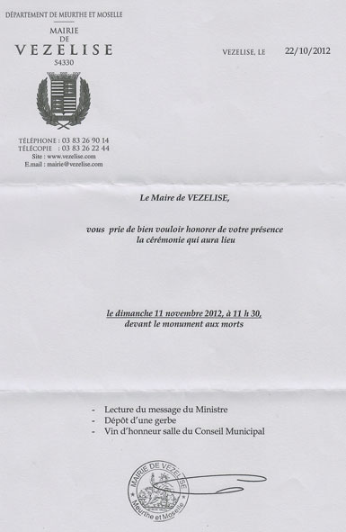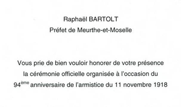 Invitations 11 novembre Nancy, Vezelise, Flavigny |