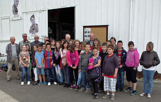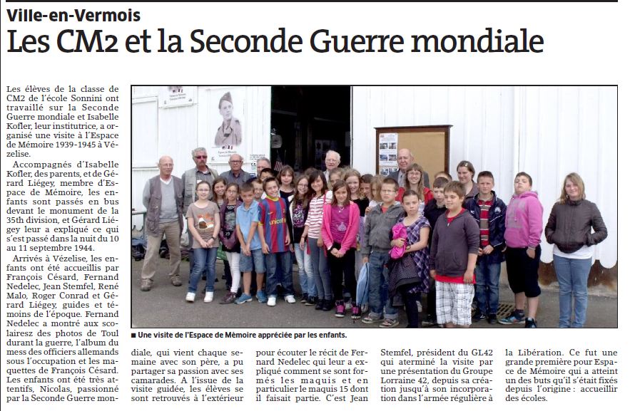 Arrivée à Vézelise, François César, Fernand Nedelec, Jean Stempfel, René Malo et Roger Conrad sont sur le pont. Quatre groupes sont constitués, François, Gérard et Nicolas, Roger, René et les visites commencent.L’attente entre les groupes est meublée par Fernand qui a apporté les photos de Toul durant la guerre ainsi que l’album du foyer du soldat allemand sous l’occupation, et par la présentation des maquettes de François. A l’issue de la visite guidée, les élèves avaient rendez-vous à l’extérieur pour un questions / réponses préparé par Fernand Nedelec. Jean Stempfel a clôturé l’après-midi par une présentation du Groupe Lorraine 42 depuis sa création jusqu’à son incorporation dans l’armée régulière à la Libération. Une grande première pour l’Espace de Mémoire qui a atteint un des buts fixé depuis l’origine. Une expérience à renouveler, surtout lorsque les enfants comme ceux de cet après-midi viennent de boucler le programme scolaire de la deuxième guerre mondiale. Sylviane Liégey