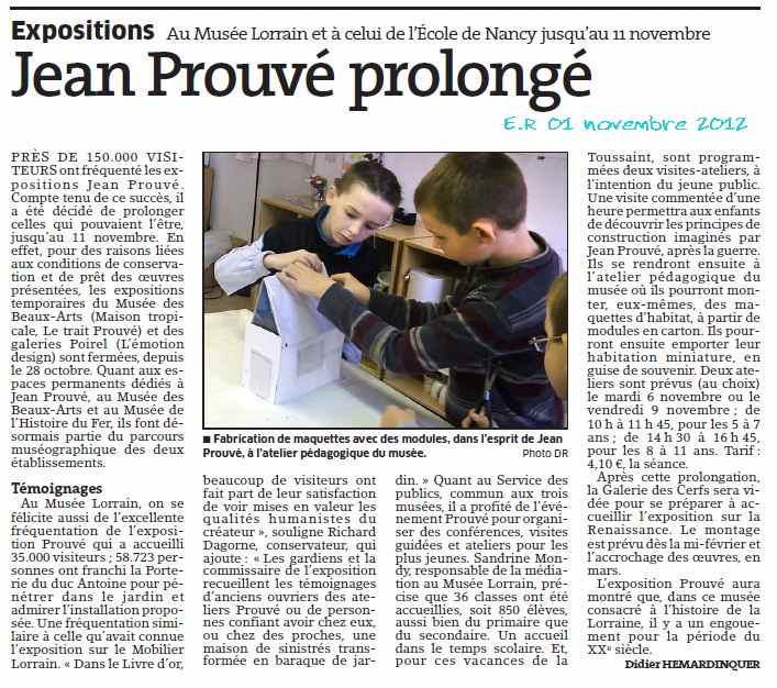 | Plusieurs abris pour sinistrés sont reconstitués et mis en scène. Des œuvres emblématiques de Jean Prouvé comme la chaise tout bois, le fourneau pyrobal sont mises en perspective de ces réalisations architecturales. L’exposition s’interroge sur le thème de l’habitat d’urgence qui demeure une préoccupation d’actualité. En partenariat avec les étudiants de l’École nationale supérieure d’architecture de Nancy, une création architecturale contemporaine, issue des travaux des étudiants, est réalisée dans les jardins du palais ducal. (*) L’association a mis des photos et quelques objets d’époque à la disposition du Musée lorrain.