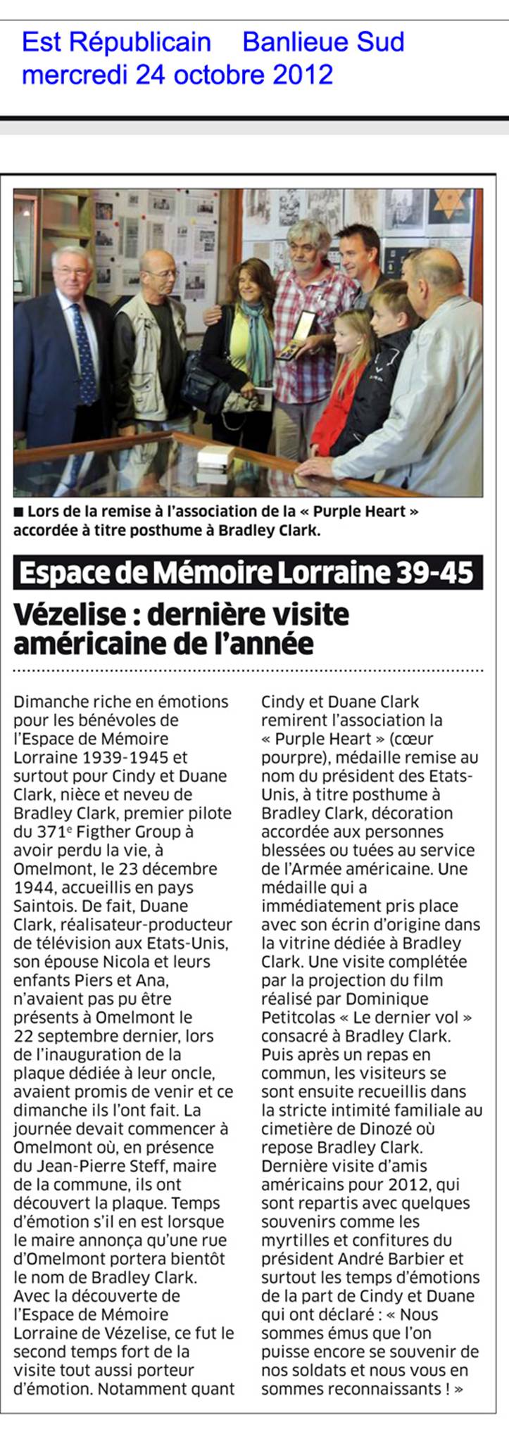 ![]() Autre grand moment d’émotion Un grand MERCI à Cindy et à Duane qui offrent la Purple Heart décernée à Bradley Clark « c’est ici qu’elle sera le mieux » |