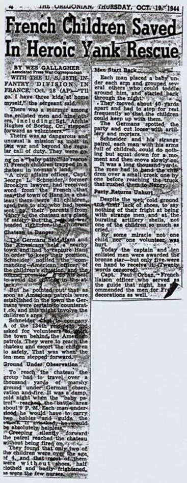 Ces articles citent les noms des deux capitaines, l’Américain, le Cpt Schneider, le Français, le Cpt Paul Orban, et précise que ce jour (19 octobre) le Cpt Schneider, et « seulement 5 » volontaires viennent de se voir remettre la Bronze Star . L’article indique « 20 mots censurés ».