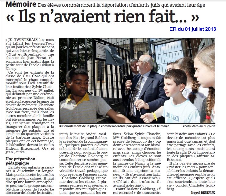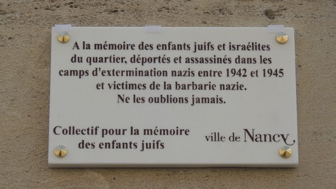 Nancy rappelle la mémoire des enfants juifs disparus dans les camps d’extermination nazis A l’initiative de Charlotte Goldberg, quatre plaques ont été posées devant les écoles Didion, Braconnot, Ory et Jean Jaurés |